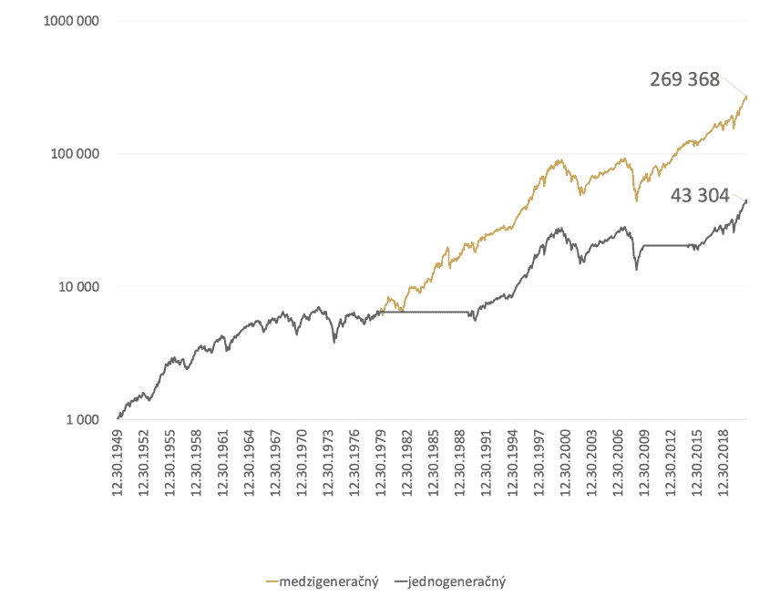 Na grafe nižšie vidieť rozdiel medzi hodnotami investícií do S&P 500 v multigeneračnom portfóliu (horná krivka) a jednogeneračnom, ktoré prechádzalo obdobiami, kedy investície neboli v trhu (spodná krivka).