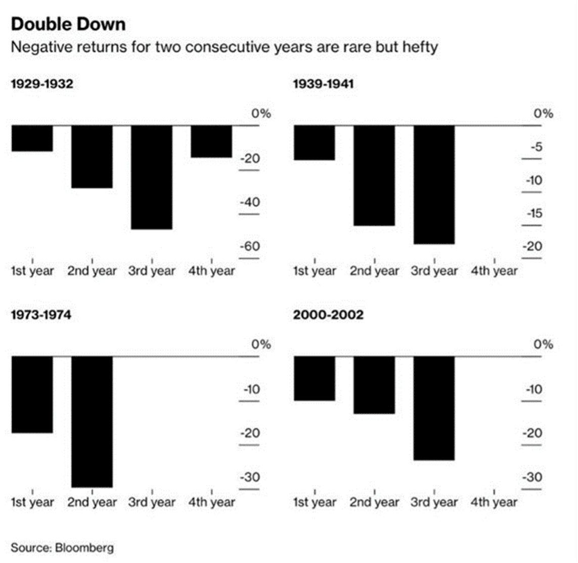 Graf 5: Obdobia dvoch a viac po sebe negatívnych rokov v histórii US akciového trhu, zdroj: Bloomberg
