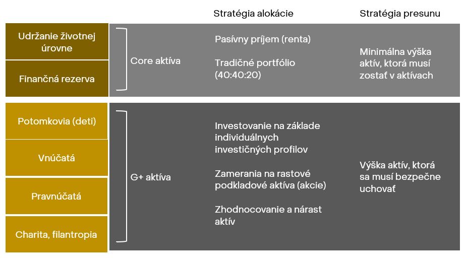 Toto rozdelenie slúži na definovanie majetku, ktorý bude využívaný tvorcom majetku (core) a majetku, ktorý bude predmetom presunu na ďalšie generácie (G+). Na základe tohto rozdelenia vieme definovať individuálne investičné ciele pri správe majetku, stratégie alokácie aktív pri príprave multigeneračného portfólia aj stratégiu presunu majetku. Príklad rozdelenia si pozrite na obrázku 1 nižšie.