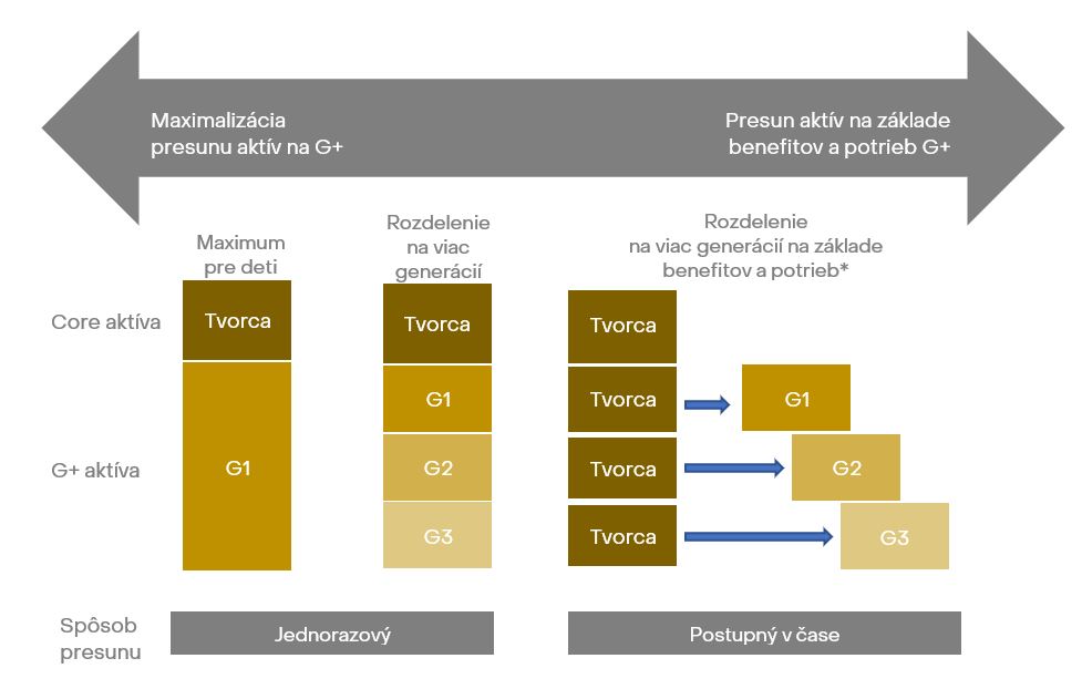 Pri tvorbe presunu majetku môžeme využiť rôzne stratégie na základe samotnej vôle tvorcu majetku, vekovej štruktúry potomkov a ich potrieb alebo vôle potomkov podieľať sa na správe aktív na základe ich vedomostí a schopností. Ich príklady môžete vidieť na obrázku 2 nižšie.