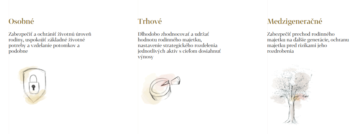 - správy finančného majetku s cieľom dlhodobo zhodnocovať investície prostredníctvom multigeneračného portfólia investičného majetku,