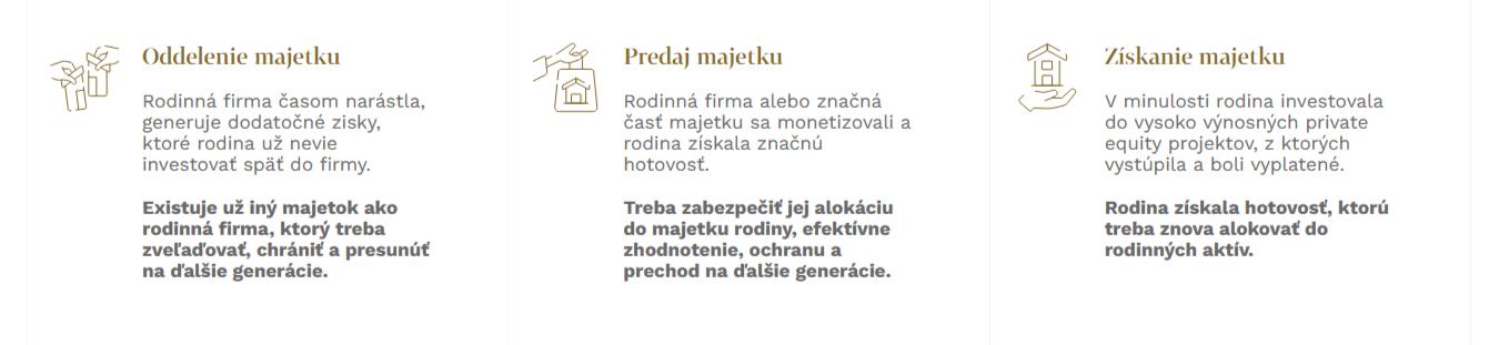 Služby poskytujeme najmä klientom v strednom veku, keď ich firma dorástla natoľko, že generuje dostatočné zisky, ktoré rodina už nevie investovať späť do firmy a tie treba ďalej zhodnocovať a ochrániť pre ďalšie generácie.