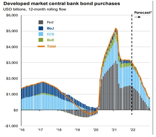 Hlavnou udalosťou bude normalizácia menovej politiky. Znamená to, že centrálne banky po dvoch rokoch od vypuknutia pandémie končia so stimulačnými balíčkami a znižujú objemy nakupovaných štátnych dlhopisov. Inak povedané – znižuje sa tlačenie peňazí. Centrálne banky vyhlásili otvorený boj s rastúcou infláciou, ktorú budú brzdiť spomínaným vypnutím nákupov štátnych dlhopisov a v USA sa dokonca dočkáme aj rastu úrokových sadzieb.